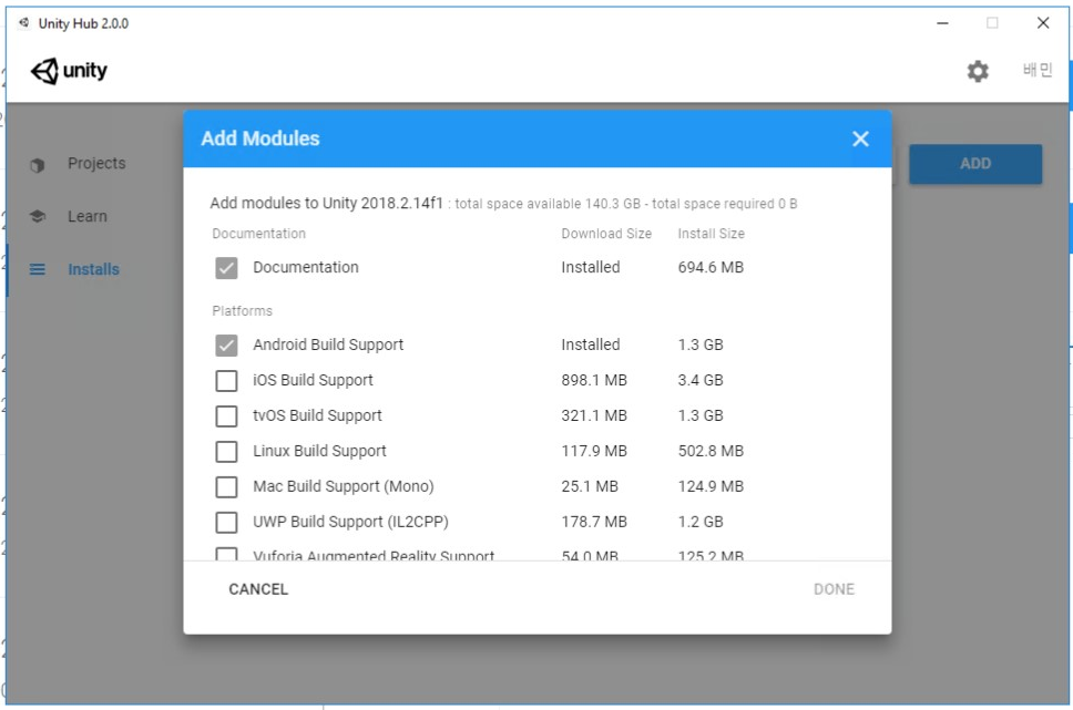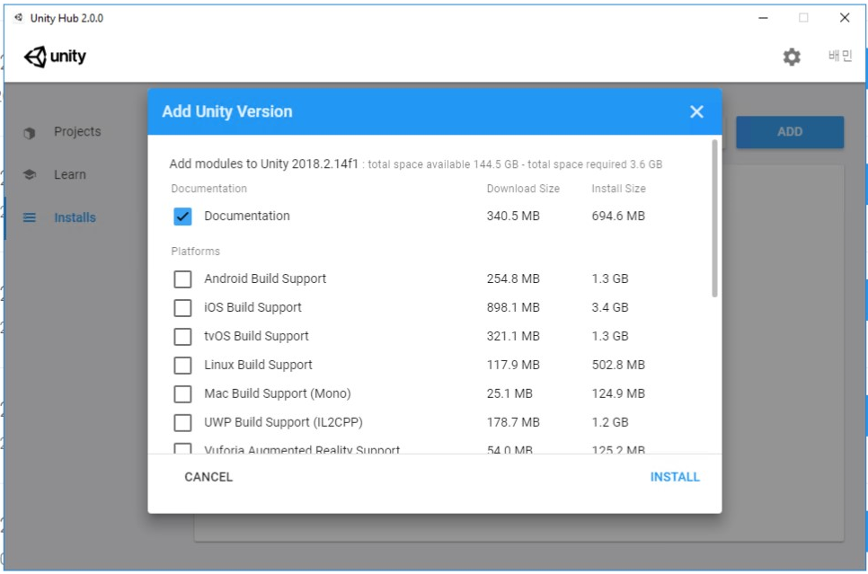 - once you click "INSTALL" button, Unity Hub will start the installation