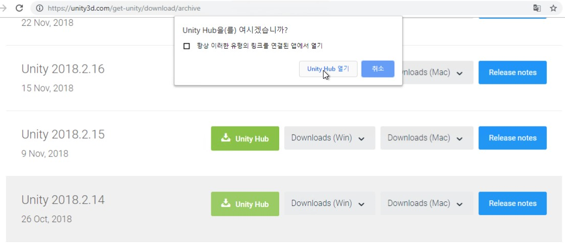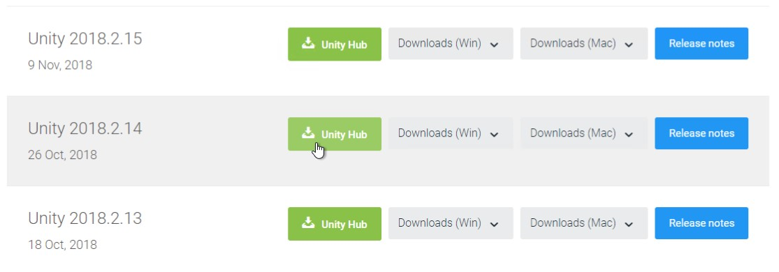 - scroll down the page and click "Unity Hub" button on Unity 2018.2.14 row